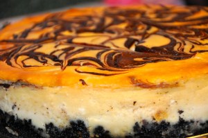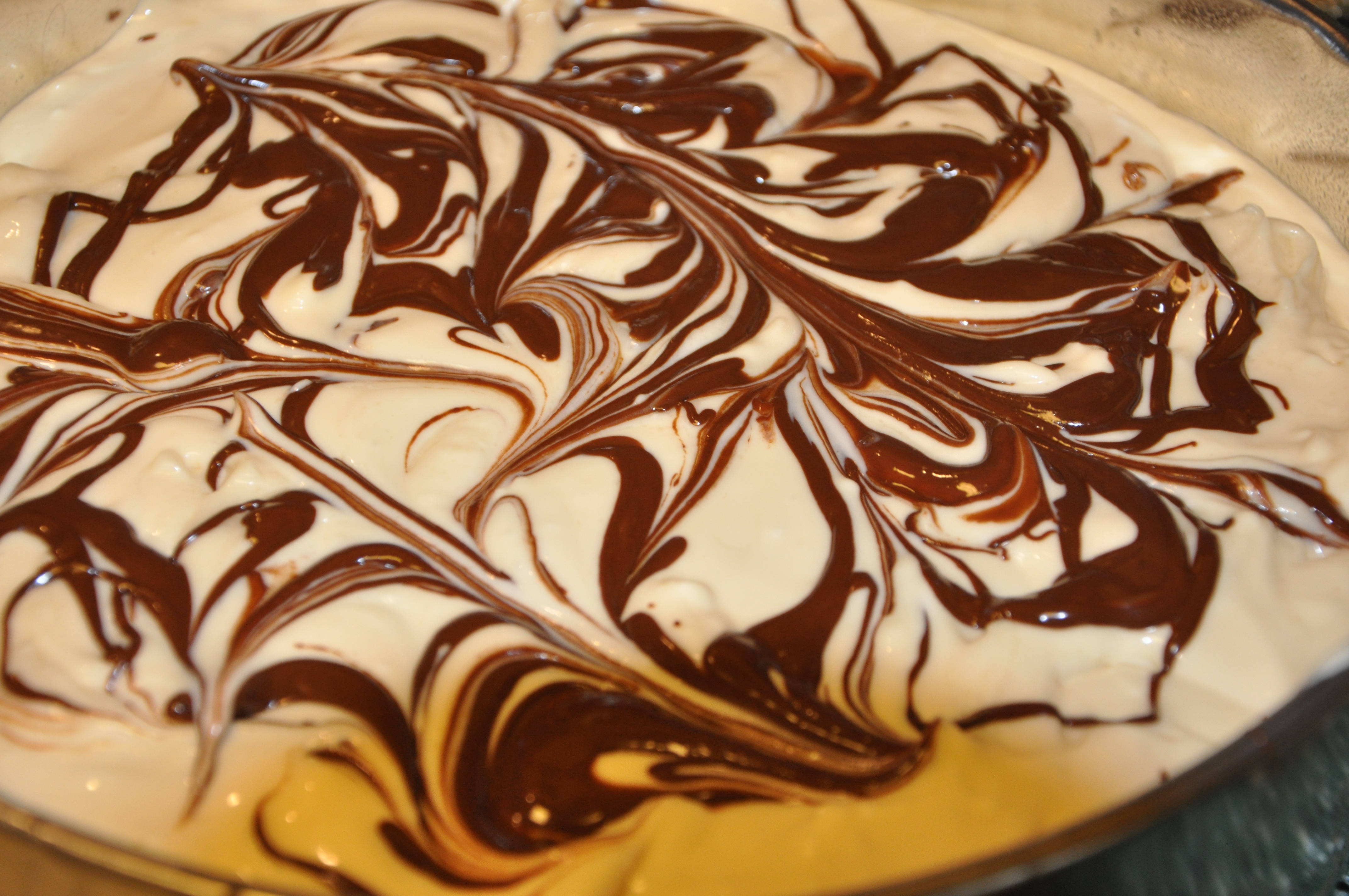 Pour 1/2 of the cheesecake mixture into the prepared pan. Drizzle 1/2 of the melted chocolate over the cheesecake. Using a knife, swirl the chocolate over the top. Repeat with the remaining cheesecake mixture and melted chocolate.