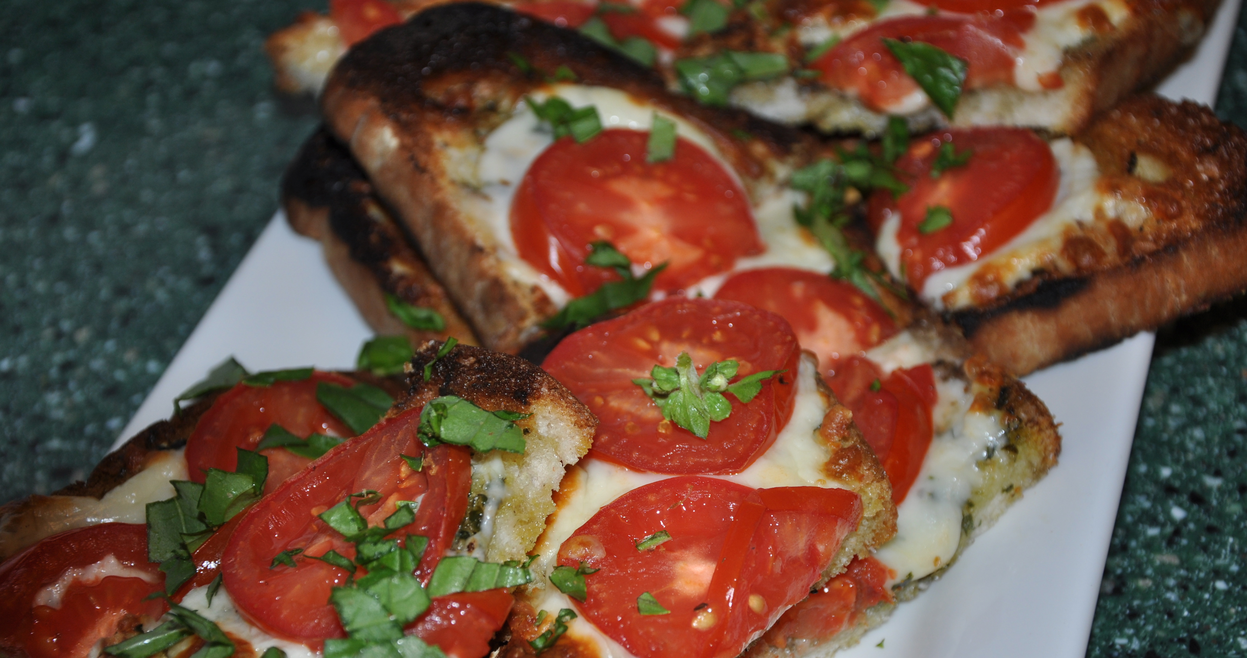 Place shredded mozzarella over bread slices, top with sliced plum tomatoes, salt & pepper. Place under broiler until cheese is golden brown. Top with freshly diced basil.