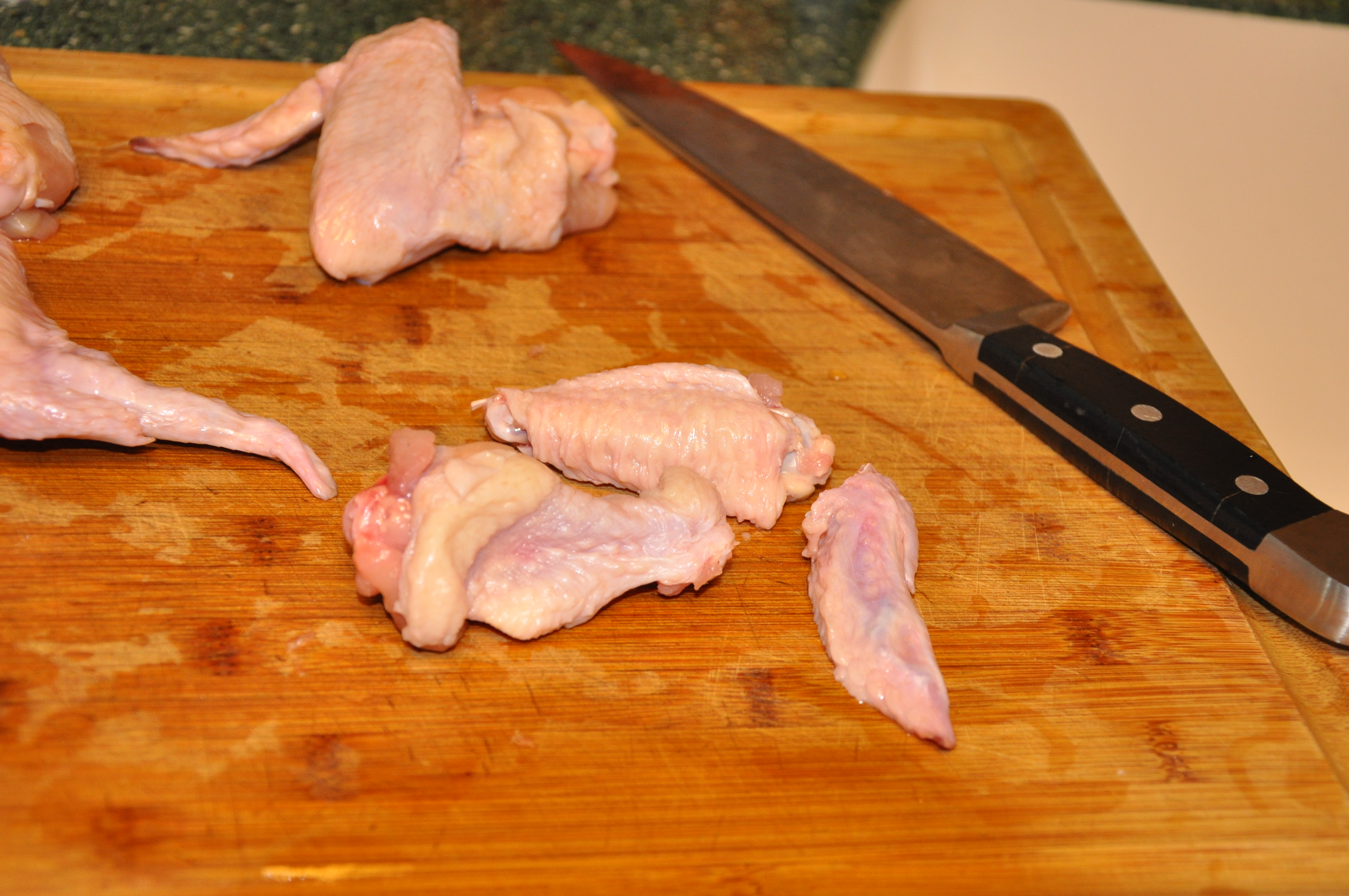 Remove the wings from package and using a very good/sharp knife cut the wings at the joints, in threes….