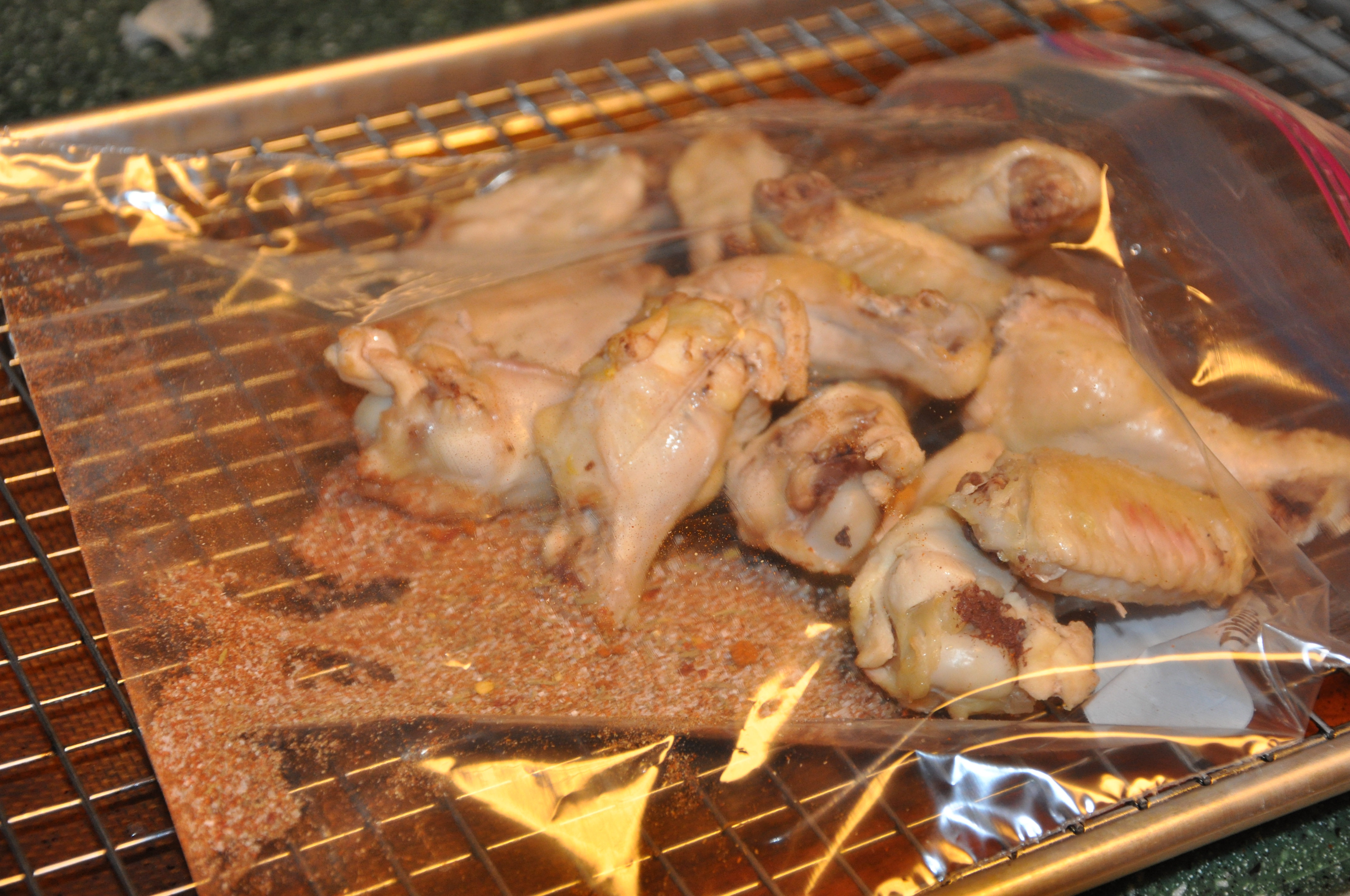 Place all spices in a zip lock bag, add wings and toss until well coated.