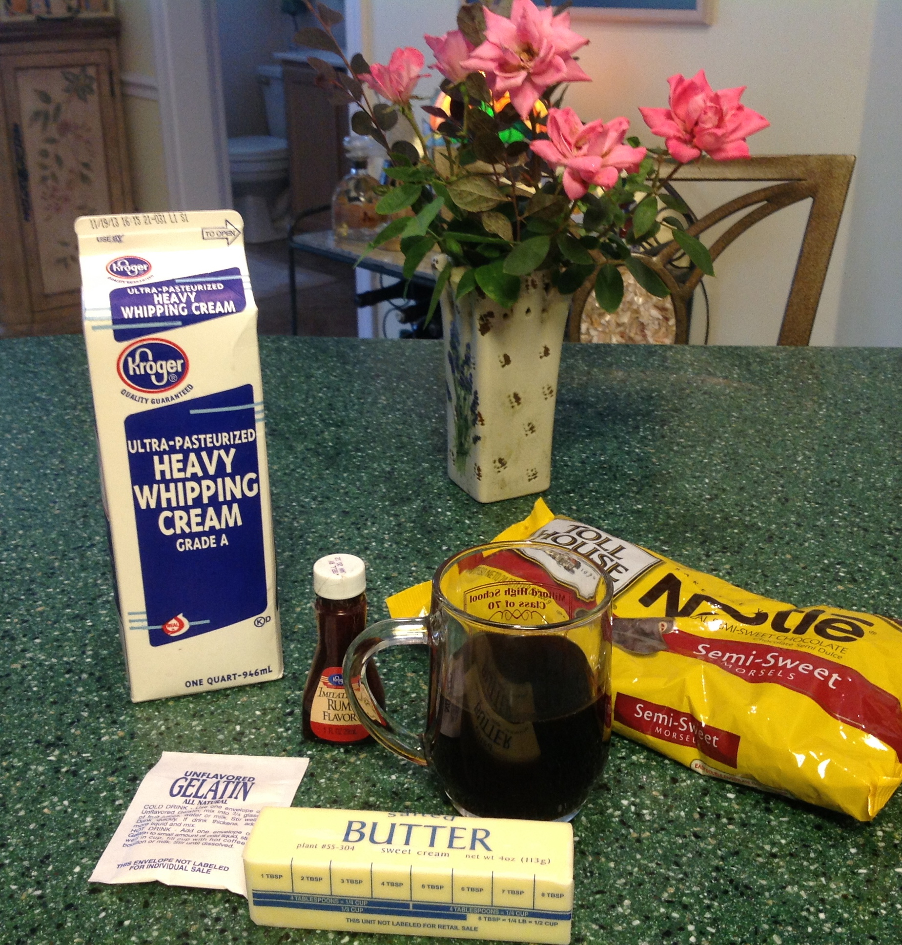 Pour 1/4 cup whipping cream into a metal measuring cup or small pan. Sprinkle in the gelatin. Let gelatin “bloom” in pan for about 10 minutes. Heat by swirling the measuring cup or pan over a low gas flame (or candle). Do not boil or gelatin will be broken. Stir gelatin mixture into cooled chocolate and set aside.