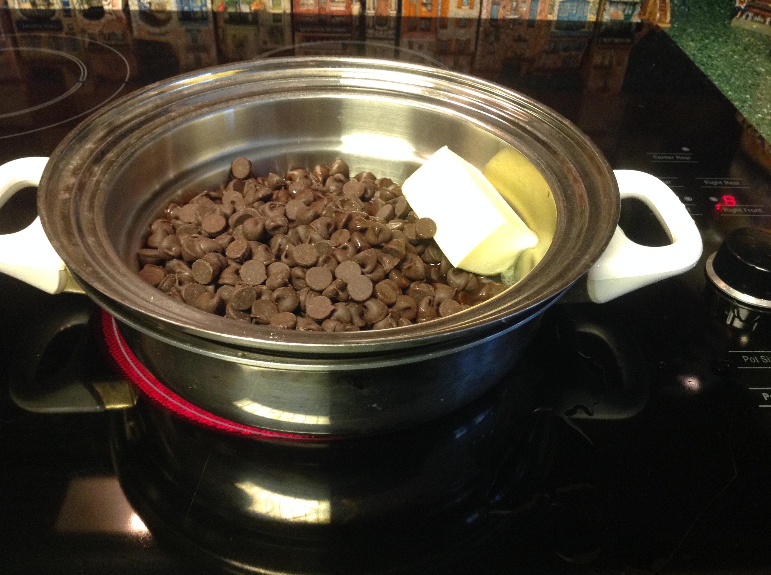 Place mixing bowl and beaters in the freezer for at least 15 minutes. Add chocolate, butter, expresso (or coffee), and rum (or extract) to a double boiler pan (or a small metal bowl).