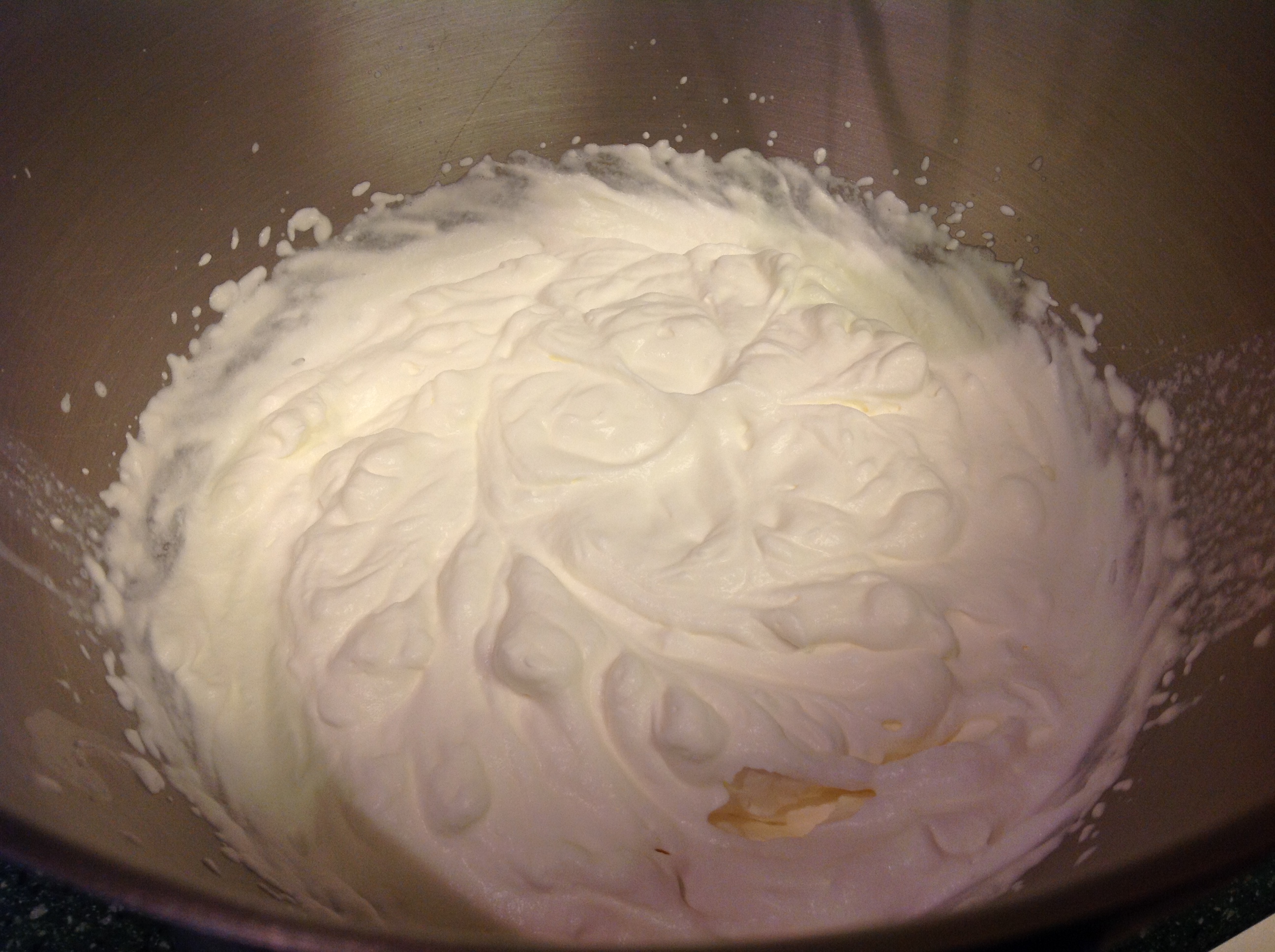 You just want to heat this, do not boil it. Stir mixture into melted chocolate and set aside. Remove your chilled bowl and beaters from the freezer and add remaining heavy cream. Whip cream until soft peaks form when beaters are removed from cream.