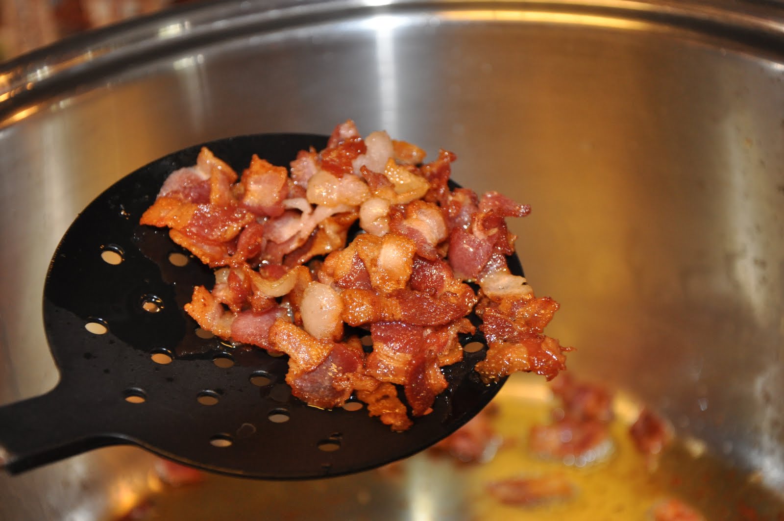 First, pre-heat a large stockpot. Add 1/4 cup extra virgin olive oil. Once the oil is heated, add 1/4 cup chopped bacon. Cook the bacon over medium heat until nice and crunchy. Once cooked, remove from the pan.