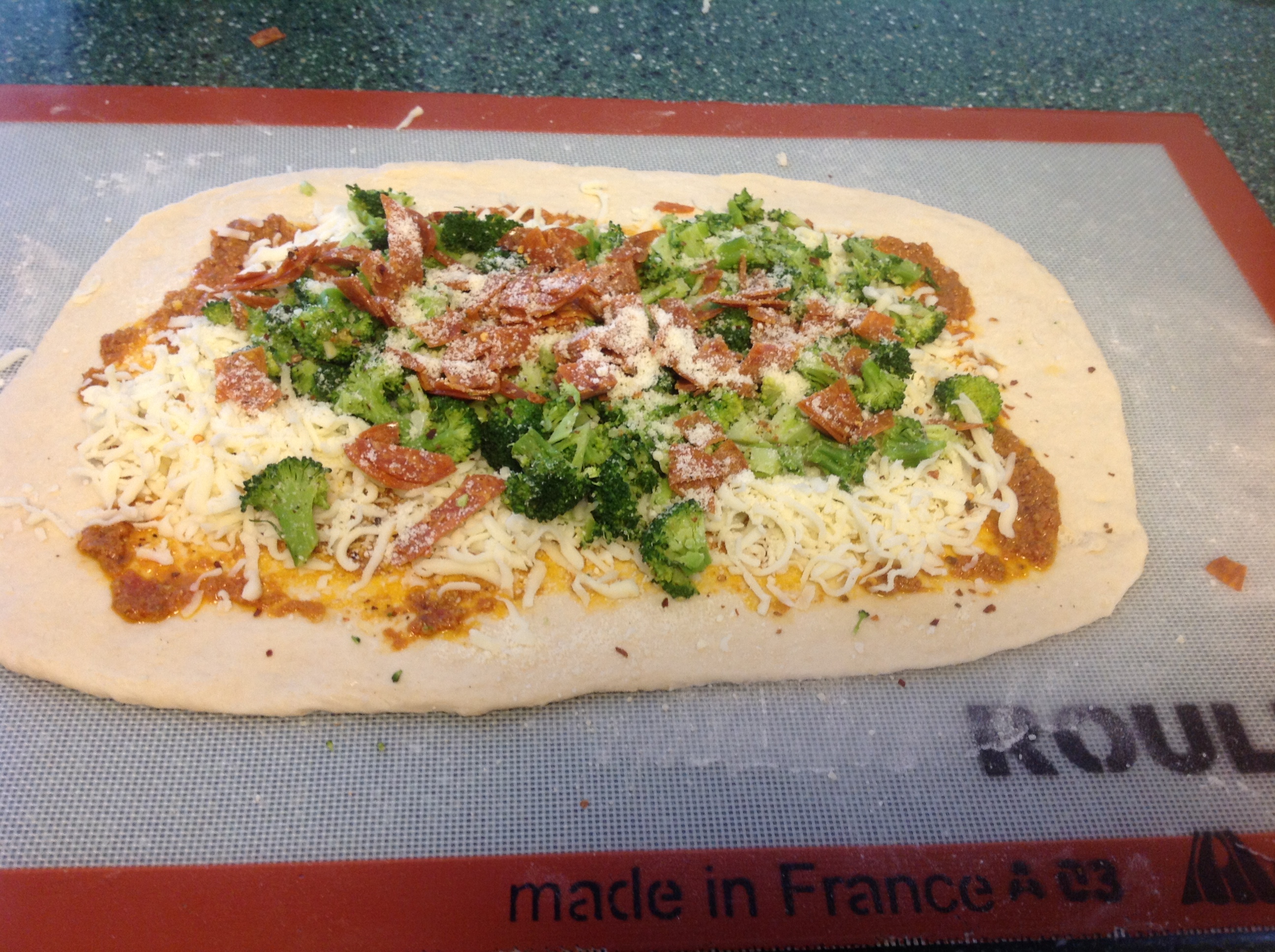 Now comes the really fun part, creating your bread…one of my favorite sayings is “you are only limited by your creativity”….this is especially true when stuffing a bread, because you can stuff it with just about anything. But, today I am making “Rob’s favorite”, so I am stuffing my bread with broccoli, pepperoni, shredded mozzarella, grated parmesan cheese and a little sun-dried tomato pesto sauce, just to “kick it up a notch”….oh yeah, and of course, red pepper flakes.