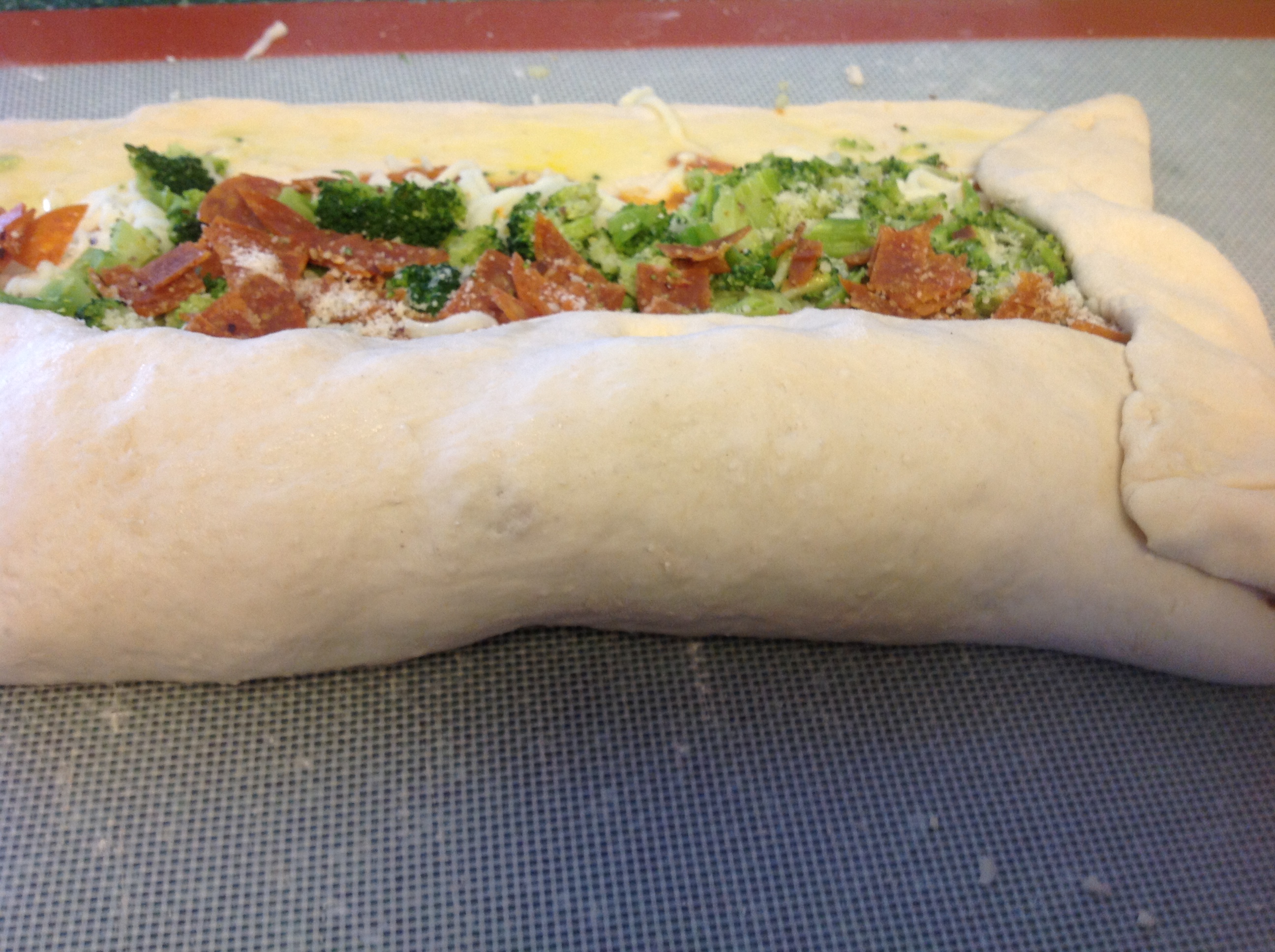 On a clean work surface or a silicon roll pad, lightly dusted with flour, place bread dough and pat down or roll dough out to a 14″x8″rectangle. Top dough with pesto sauce (if desired) leaving a 1-inch edge. Top pesto sauce with 1 ½ cups shredded mozzarella, cooked broccoli and ¼ cup chopped pepperoni. Sprinkle 2 tablespoons grated parmesan cheese over pepperoni.