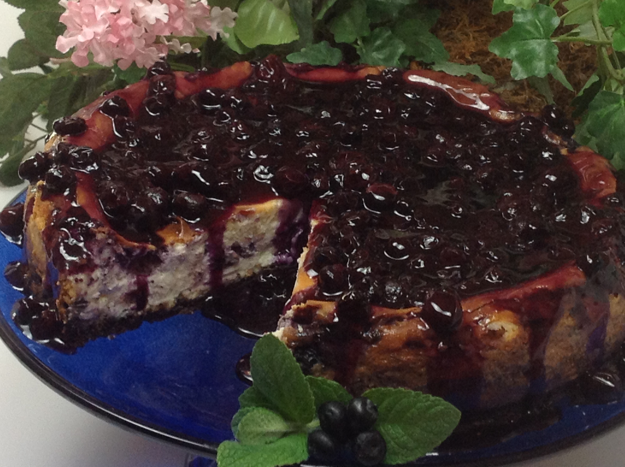 When making cheesecakes, alway bake at least a day or two before serving for added flavor. You can change my “blueberry sauce” to any type of fresh fruit you prefer, as well as the frozen fruit inside the cheesecake.