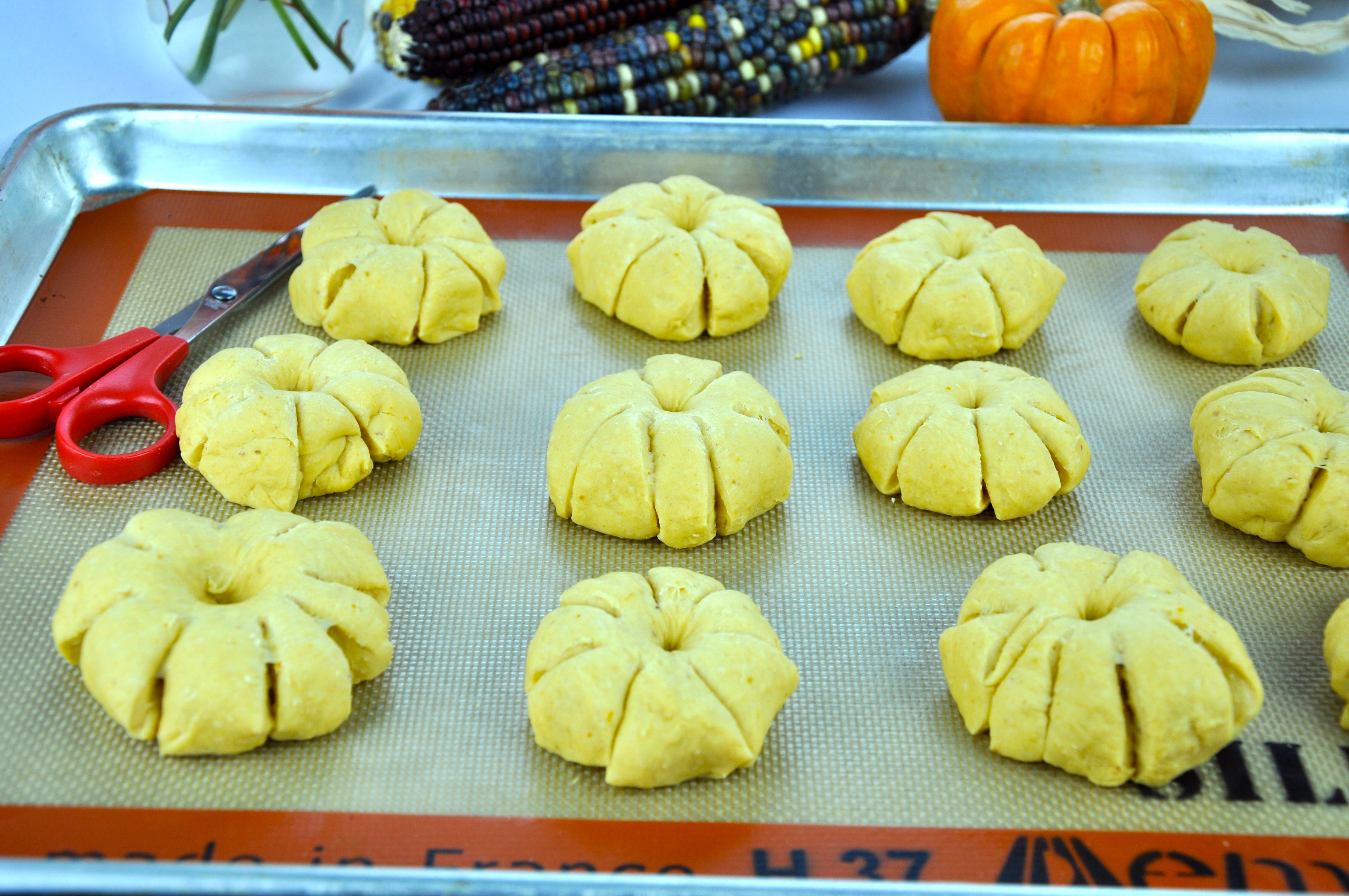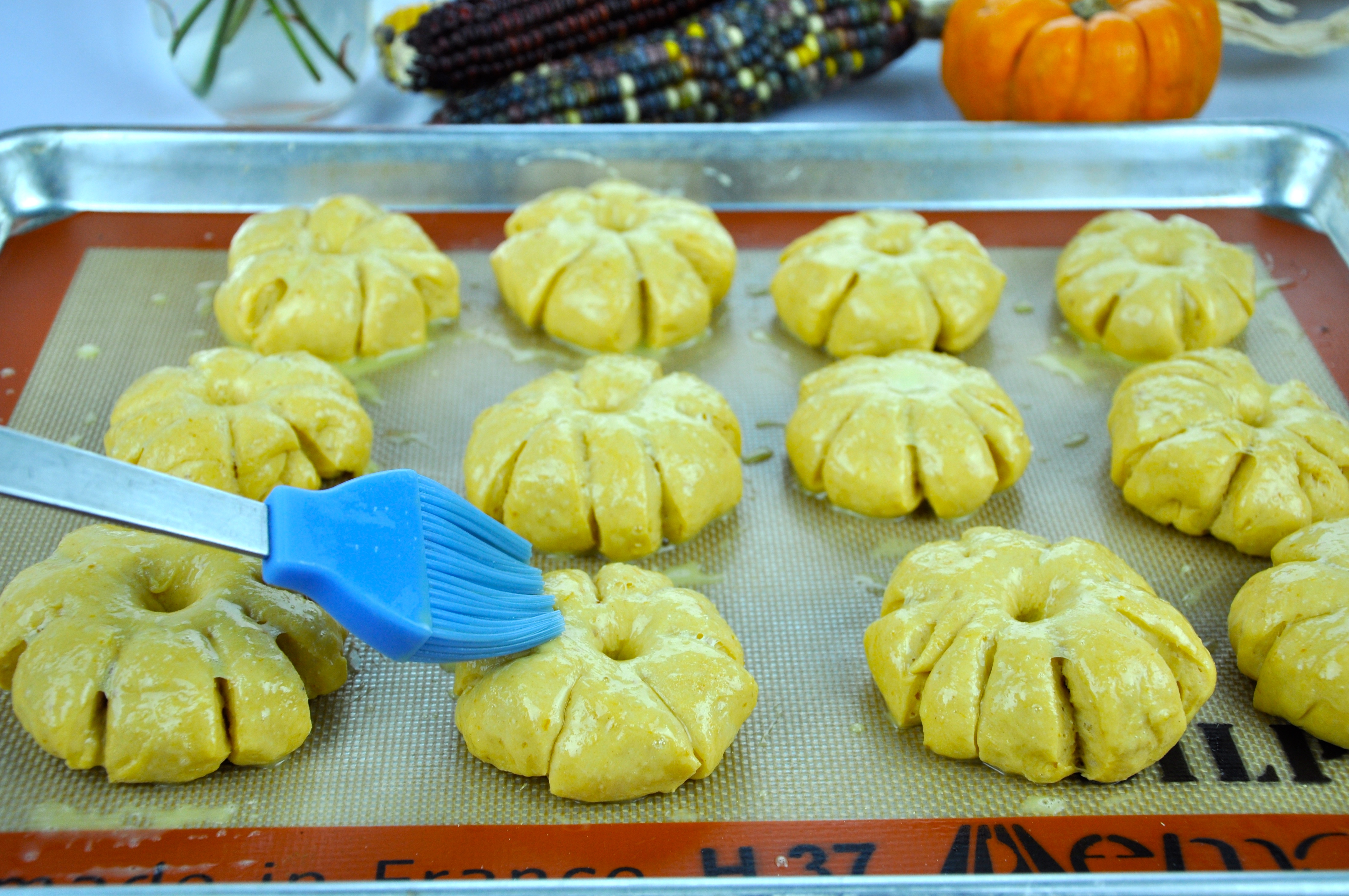 Place prepared mini pumpkins on a baking pan lined with parchment paper or spray with pan spray. Let the rolls rise another 10 minutes.