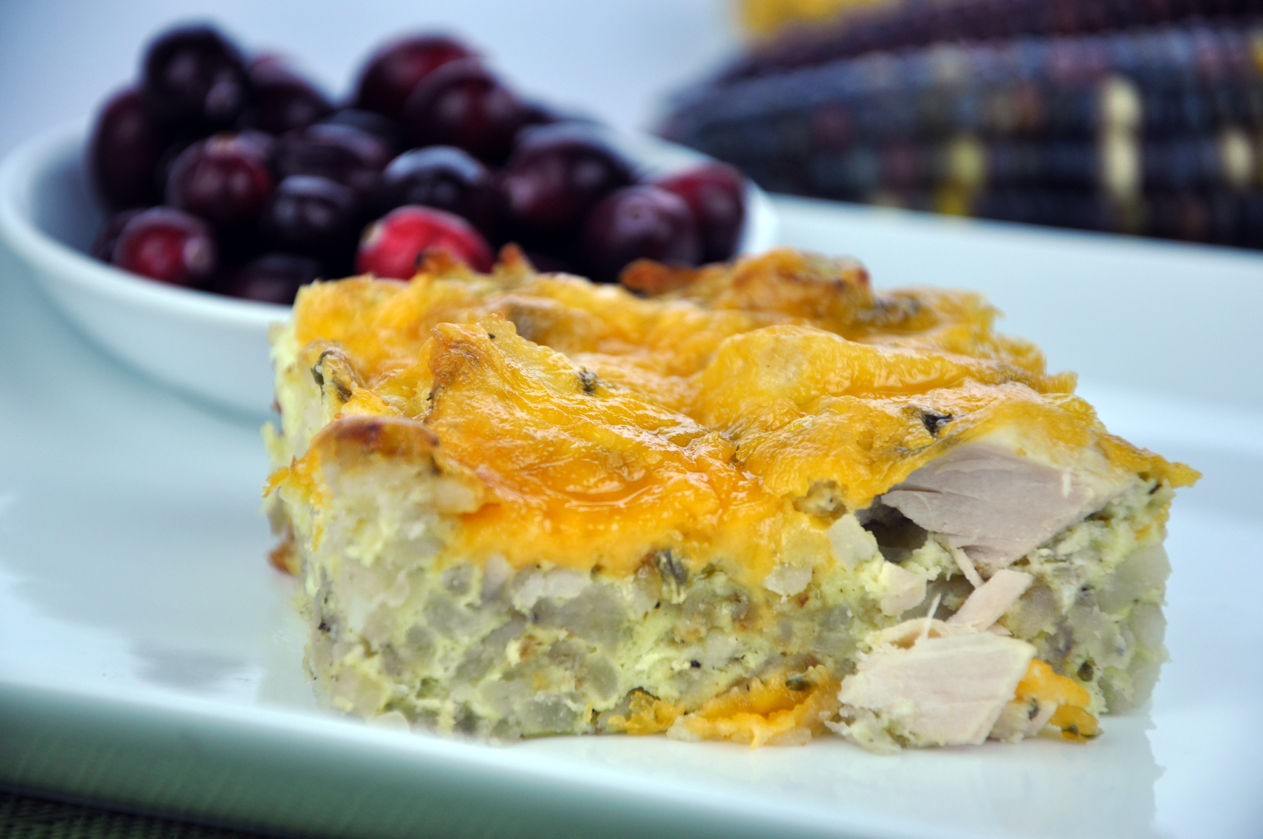 Place potato mixture in prepared baking dish. Top mixture with chopped turkey, pour egg mixture over turkey. Sprinkle shredded cheese on top. Bake 25-30 minutes or until top is golden brown.